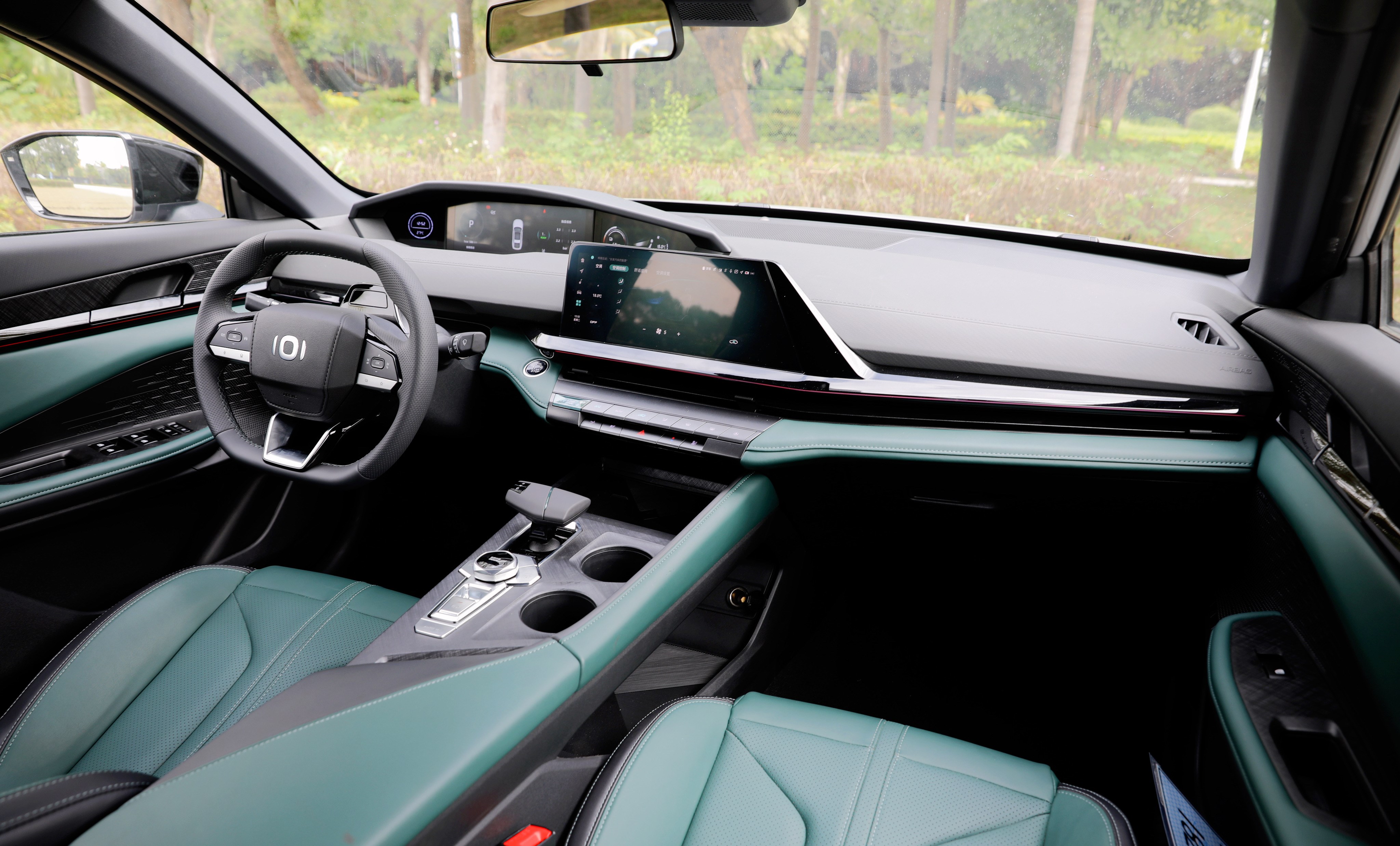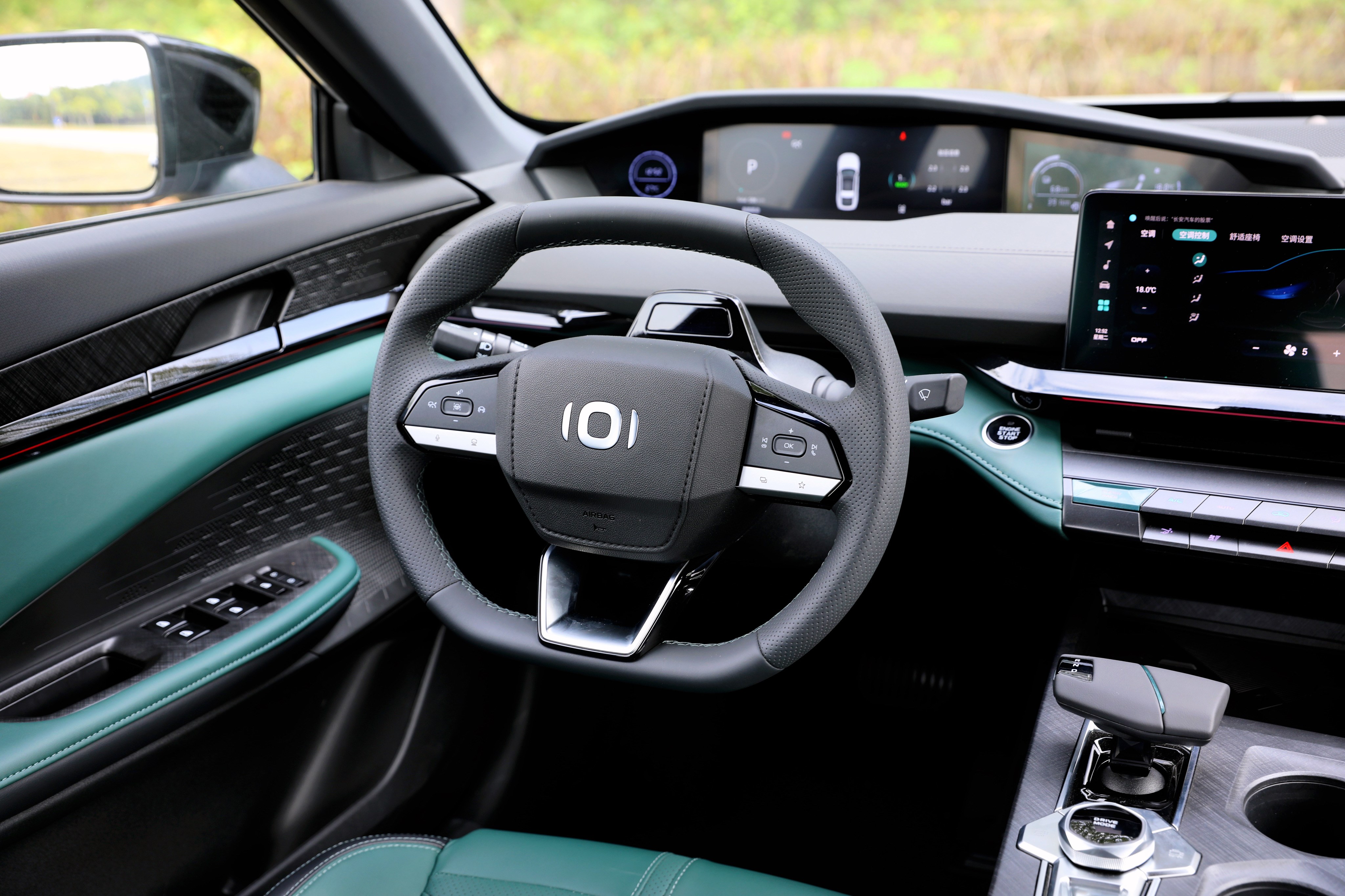 進(jìn)入車內(nèi),長安啟源A06座艙風(fēng)格很獨特,富有層次感的造型讓你第一眼會感覺很復(fù)雜,但是仔細(xì)品味一番后,它特殊的風(fēng)格可以說是別有一番風(fēng)味。啟源A06提供流沙白和林蹤綠兩種面料配色,個人更喜歡林蹤綠的配色方案,更能體現(xiàn)出動感、時尚的一面。