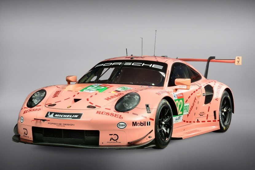 毫無疑問,這是一款現(xiàn)代化的賽車——911 RSR(991),其出征了 2018 年的勒芒 24 小時(shí)耐力賽 GTE-Pro 組別的角逐。最終這臺身披“粉豬”涂裝的 92 號 911 RSR 賽車在與法拉利、寶馬、福特、克爾維特、阿斯頓·馬丁五大制造商車隊(duì)的同場競技中斬獲組別冠軍。更值得一提的是,雖然未出現(xiàn)在展臺,但身披樂富門涂裝的 91 號911 RSR賽車斬獲亞軍,包攬組別前兩名。這款“粉豬”涂裝的 92 號 911 RSR 賽車不由令人想起保時(shí)捷 917/20 賽車征戰(zhàn) 1971 年勒芒比賽時(shí)的情景。車身圖案為粉色豬肉切割圖的樣式,這一由保時(shí)捷設(shè)計(jì)師 Anatole Lapine 提出的設(shè)計(jì)理念在當(dāng)年的法國薩爾特省引起轟動(dòng)。時(shí)至今日,被稱做“松露獵人”的保時(shí)捷 917/20 賽車仍是最著名的保時(shí)捷賽車之一。