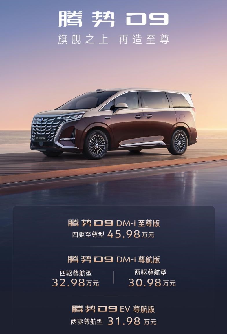 8月29日,騰勢(shì)D9新品正式上市,共推出至尊版、尊航版4款型,官方指導(dǎo)價(jià)30.98萬(wàn)元起。騰勢(shì)D9新品標(biāo)配超過(guò)200項(xiàng)科技豪華配置,并在旗艦之上再造至尊,滿足用戶更加多元化的科技豪華MPV需求。